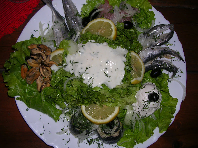 Mancarea acum: preferatele mele aici au fost turta cu cascaval si salata “Dar din mare”, dupa nume va dati seama ce contine…si unde mai pui ca avea si 500 de grame; si nu 300 de grame de frunze ca la noi. Poate in poza nu pare impresionanta, dar va garantez ca era marisoara.